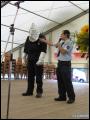 | Am Nachmittag fand eine Feuerwehr-Modenschau im Festzelt statt, bei der die Gäste einige Einsatzgarnituren bestaunen konnten. Neben den gewohnten Uniformen und der Brandschutzkleidung wurden ein Waldarbeiter-Anzug, ein Imkerschutz, ein Überlebensanzug für Gewässer, die Höhenretter-Uniform, sowie schwere Chemieschutzanzüge und Hitzeschutzanzüge vorgeführt. Marcel Walter, der die Modenschau moderierte, ging hier auf spezielle Details eines jeden Anzugs ein. So hat zum Beispiel der Waldarbeiter eine ganz spezielle Schutzkleidung, die innen aus einer Vielzahl langer Fasern besteht. Durchtrennt die Kette der Motorsäge die oberste Stoffschicht der Schutzhose, werden ganze Faserbündel herausgerissen. Die losen Fasern blockieren das Kettenrad völlig und bringen die Sägekette somit zum Stillstand. Dadurch wird das Risiko einer Verletzung erheblich vermindert.